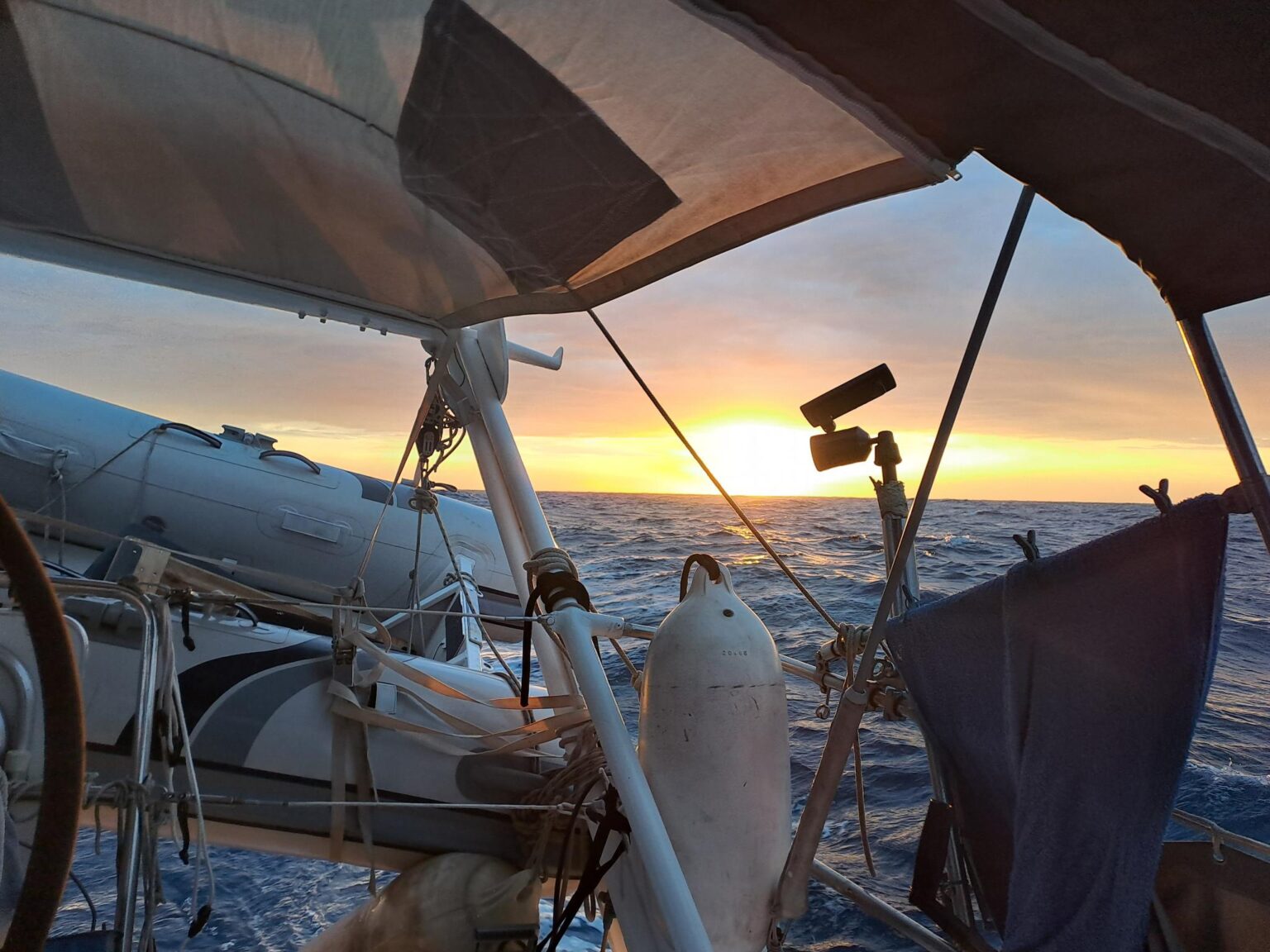 H22 : le soleil se lève enfin après cette nuit de navigation difficile. Ça fait du bien de le voir ! Ça réchauffe. Le vent est bien tombé. Il souffle à bonne allure, nous pouvons de nouveau déployer totalement nos voiles et poursuivre jusqu'aux Baléars.