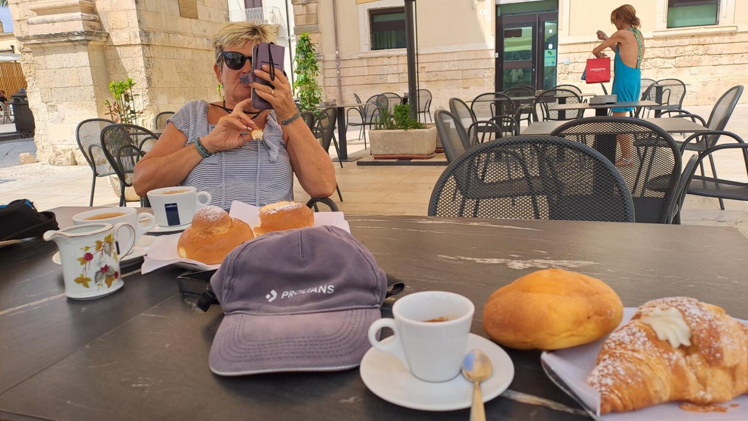 Nous voilà parti pour Noto. Afin de ne pas laisser l'annexe sur la plage la journée, Philippe nous a déposé puis a ramené l'annexe au bateau pour la sécuriser. Il est revenu a la nage ensuite. On est allé prendre notre bus pour Noto.