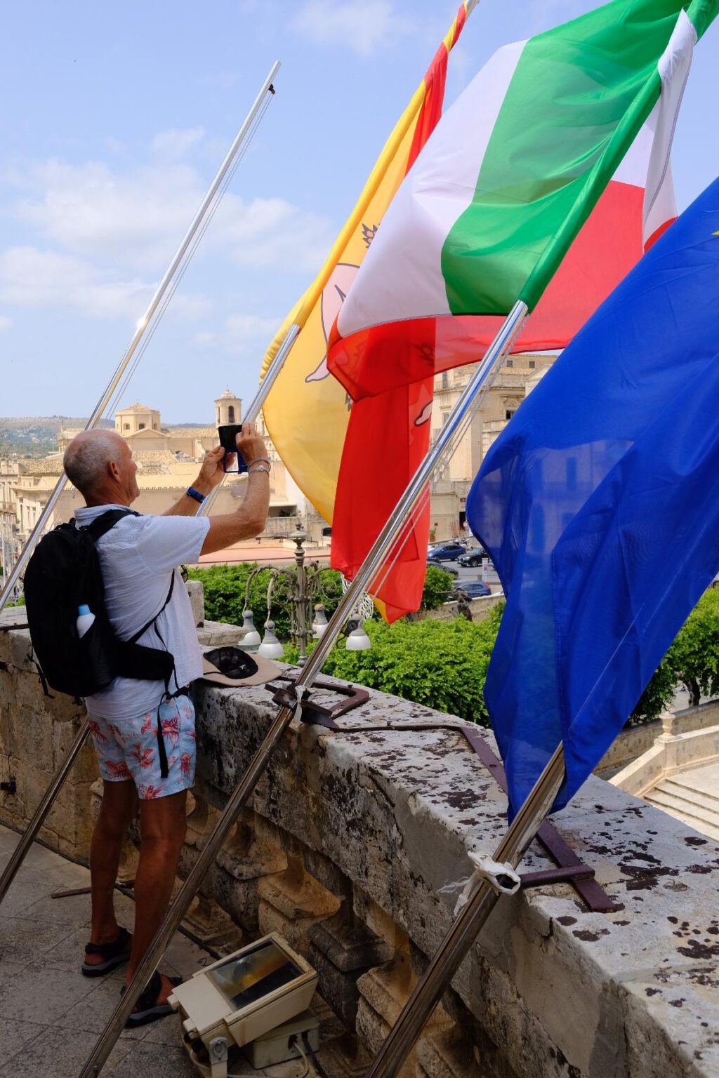 Les drapeaux flottent dans le vent, et nous figeons le mouvement en photo. Le drapeau représentant un visage dont part 3 jambes est celui de Sicile. Représentant les 3 régions fe l’île.