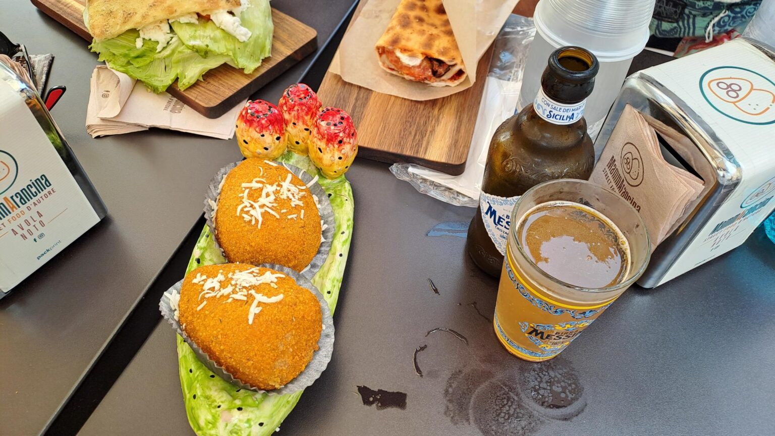 On prend ensuite le déjeuner : Arancini. Une spécialité de Sicile. Ce sont des boulues de riz panés complétés avec du jambon, de la tomate, de la mozza ou un autre fromage… plusieurs goûts sont disponibles.