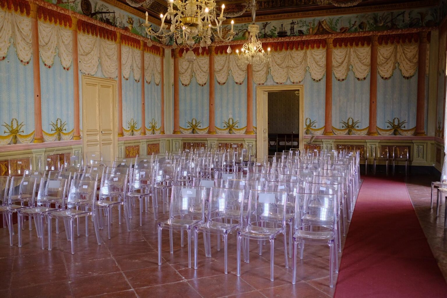 Les pièces sont en enfilade : sale du billard, salon de thé, salle de bal. Tout y est. Il y avait également les portes secrètes pour l’accès des domestiques.