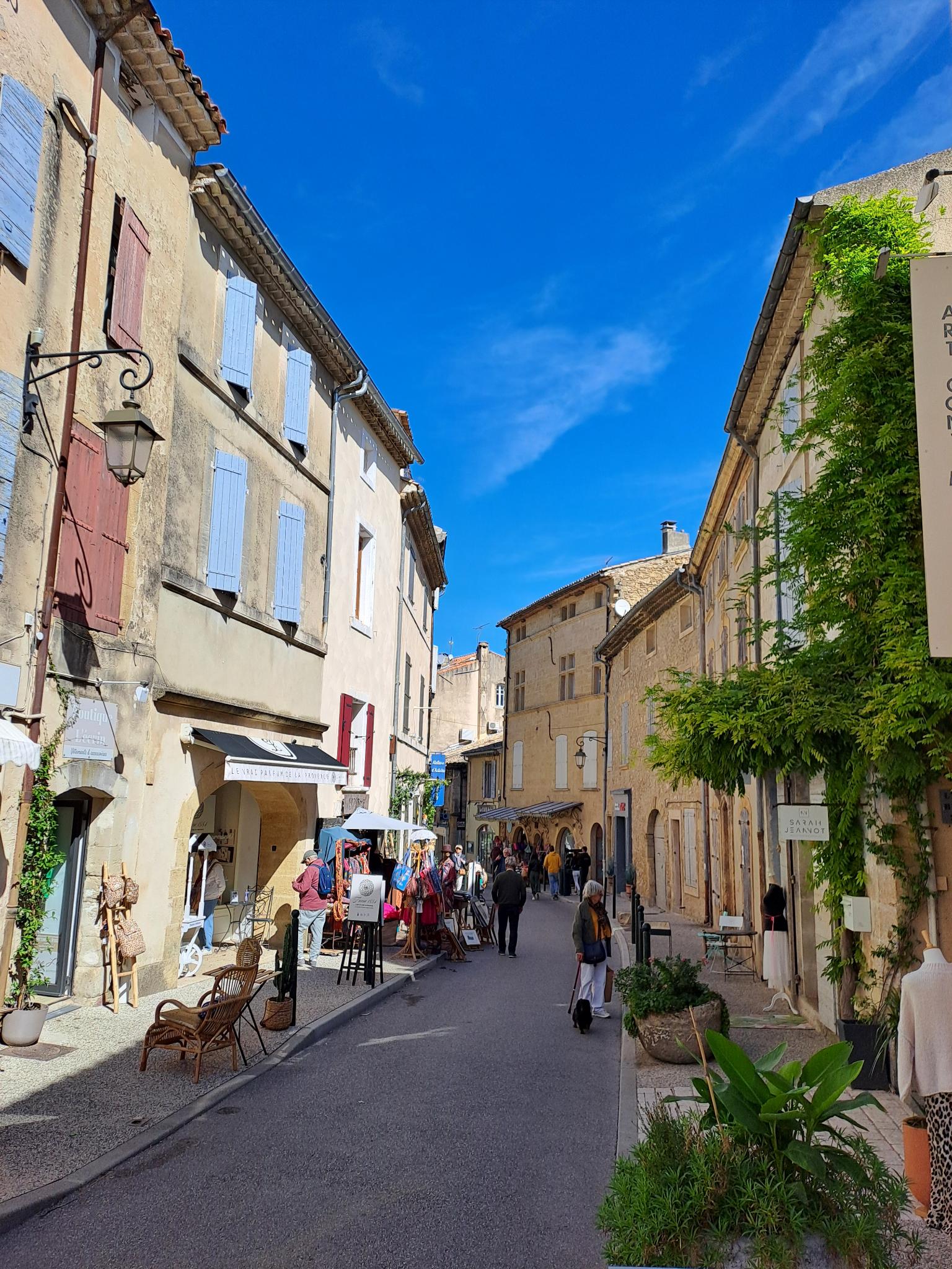 Après avoir tourné autour du village pour trouver un endroit où cadenasser les vélos (tous les villages ne proposent pas de parkings spécifiques), on s’est baladé dans les petites rues du centre bourg. Les trottoirs sont bordés de commerces en tout genre : restaurants, cafés, boutiques de vêtements de créateurs, galeries d’arts.