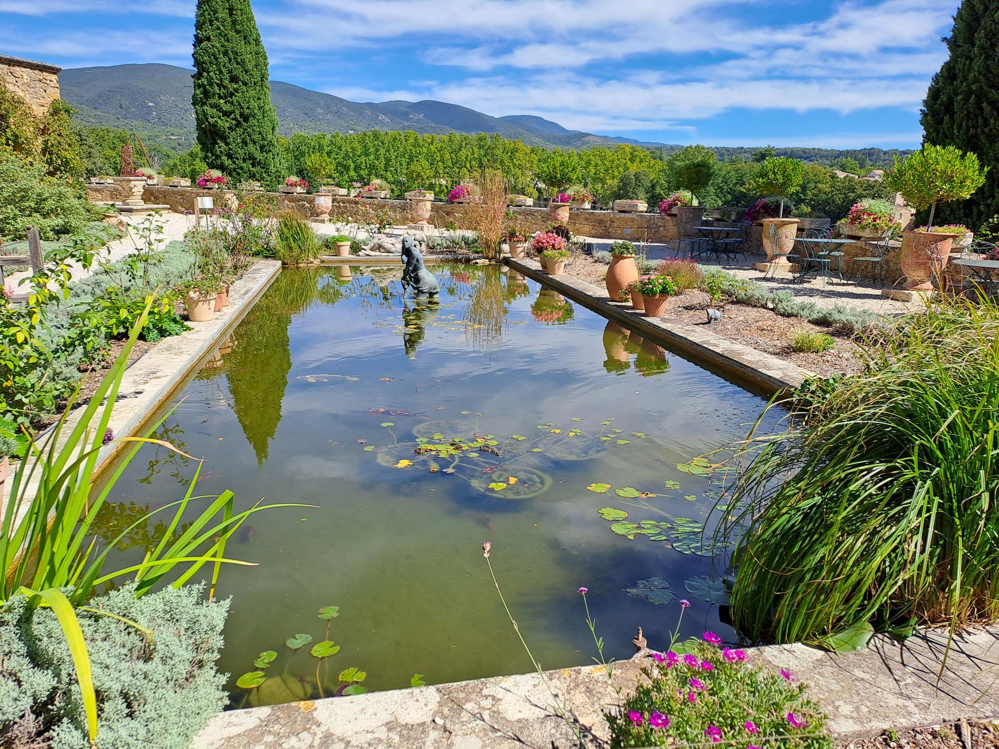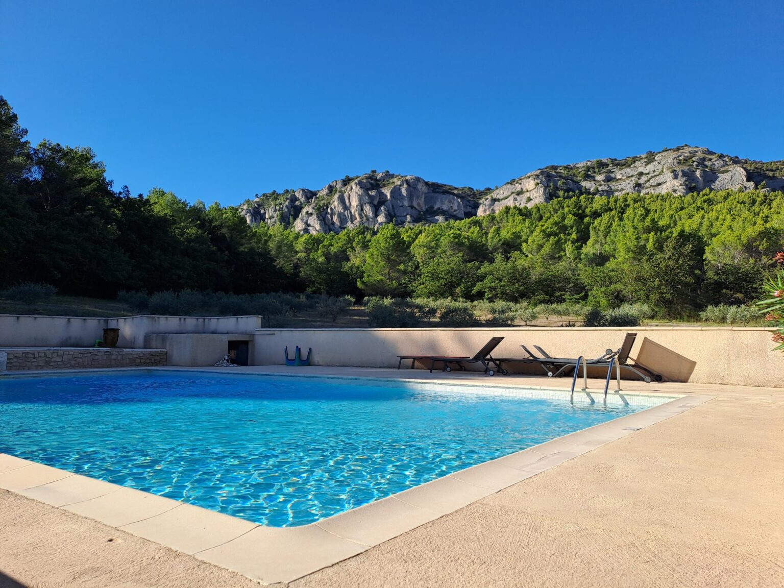 La piscine a une belle vue sur le Lubéron, mais bon l’eau à 17 degrés et le mistral à 19 degrés ne donne pas vraiment envie d’aller y faire trempette.