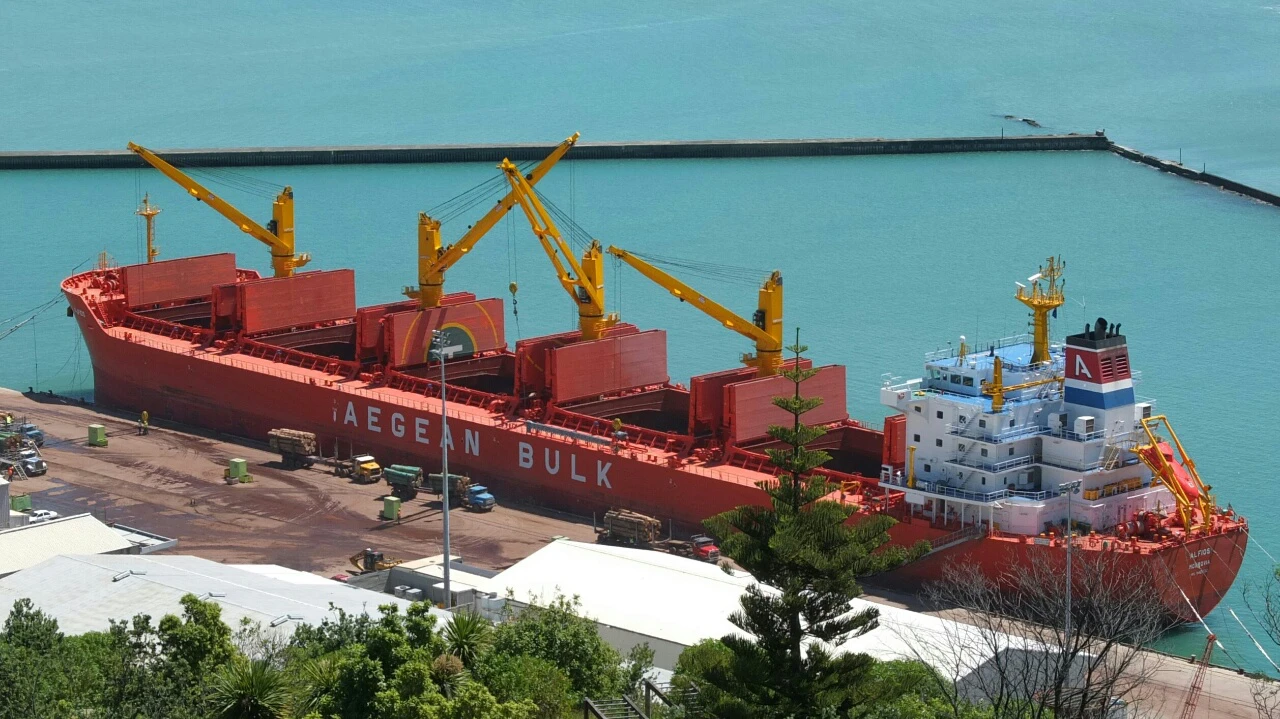 The bay and the container boat. The logging trucks are busy dropping the wood for the boat to transport it further somewhere.