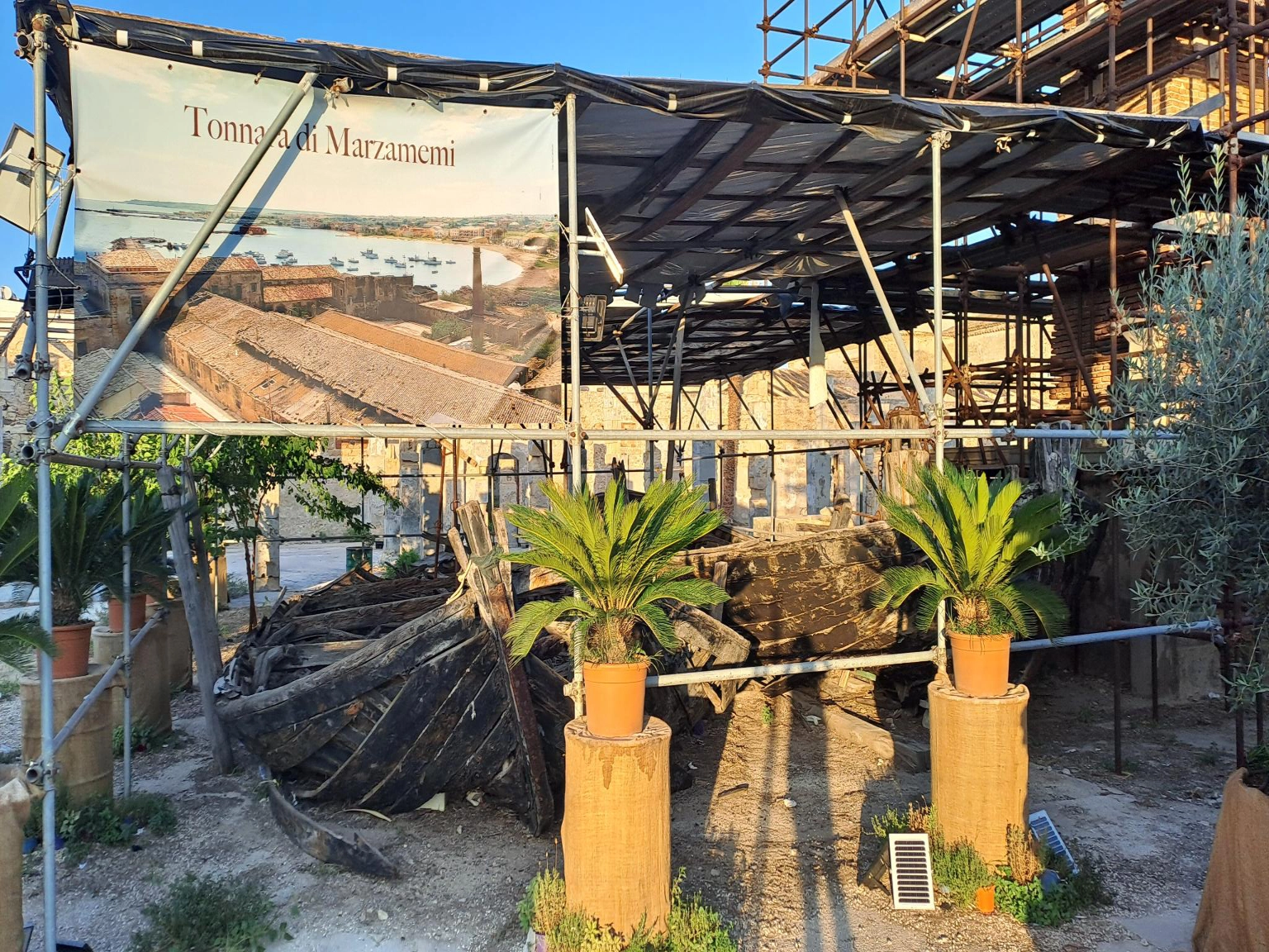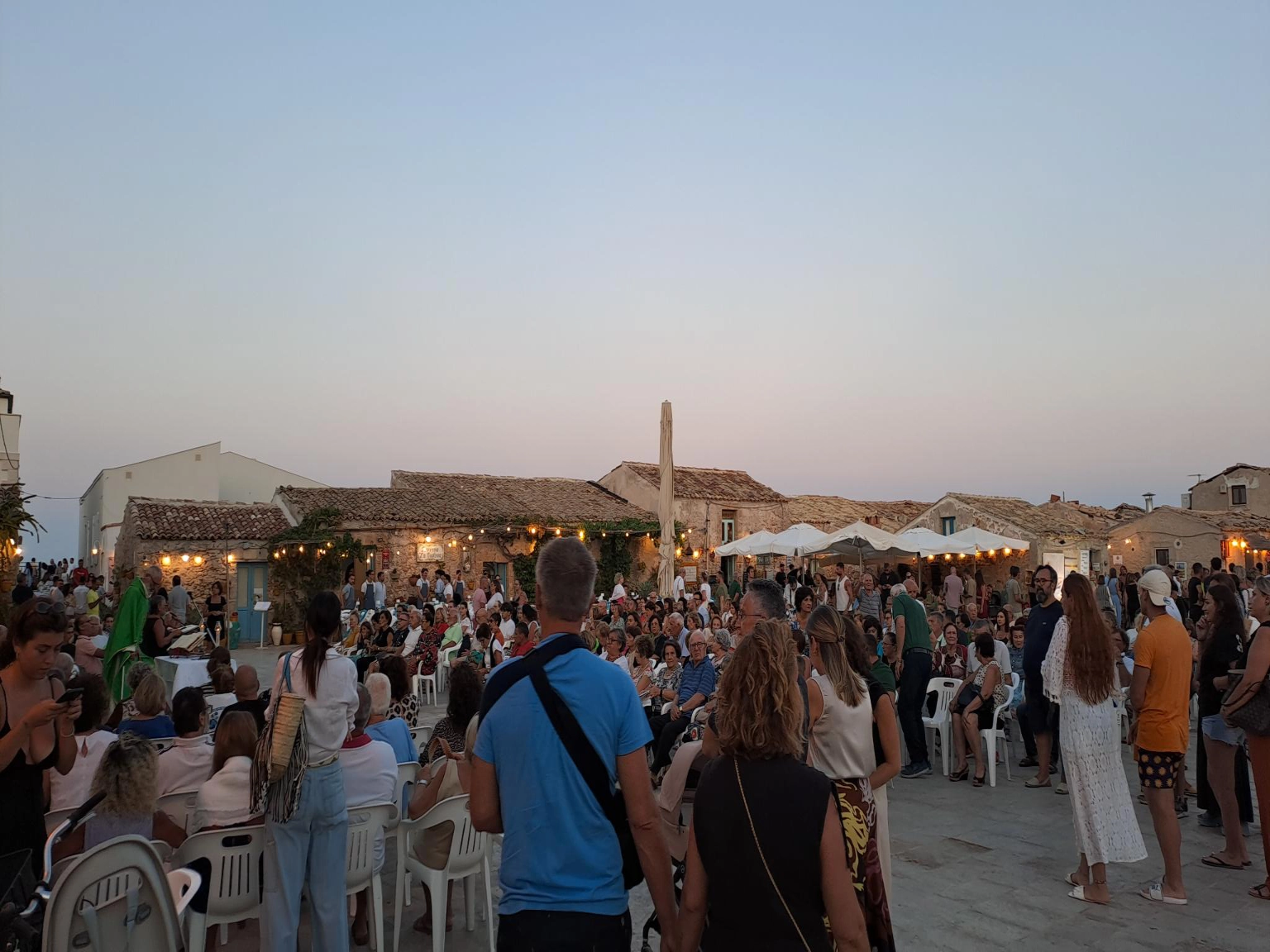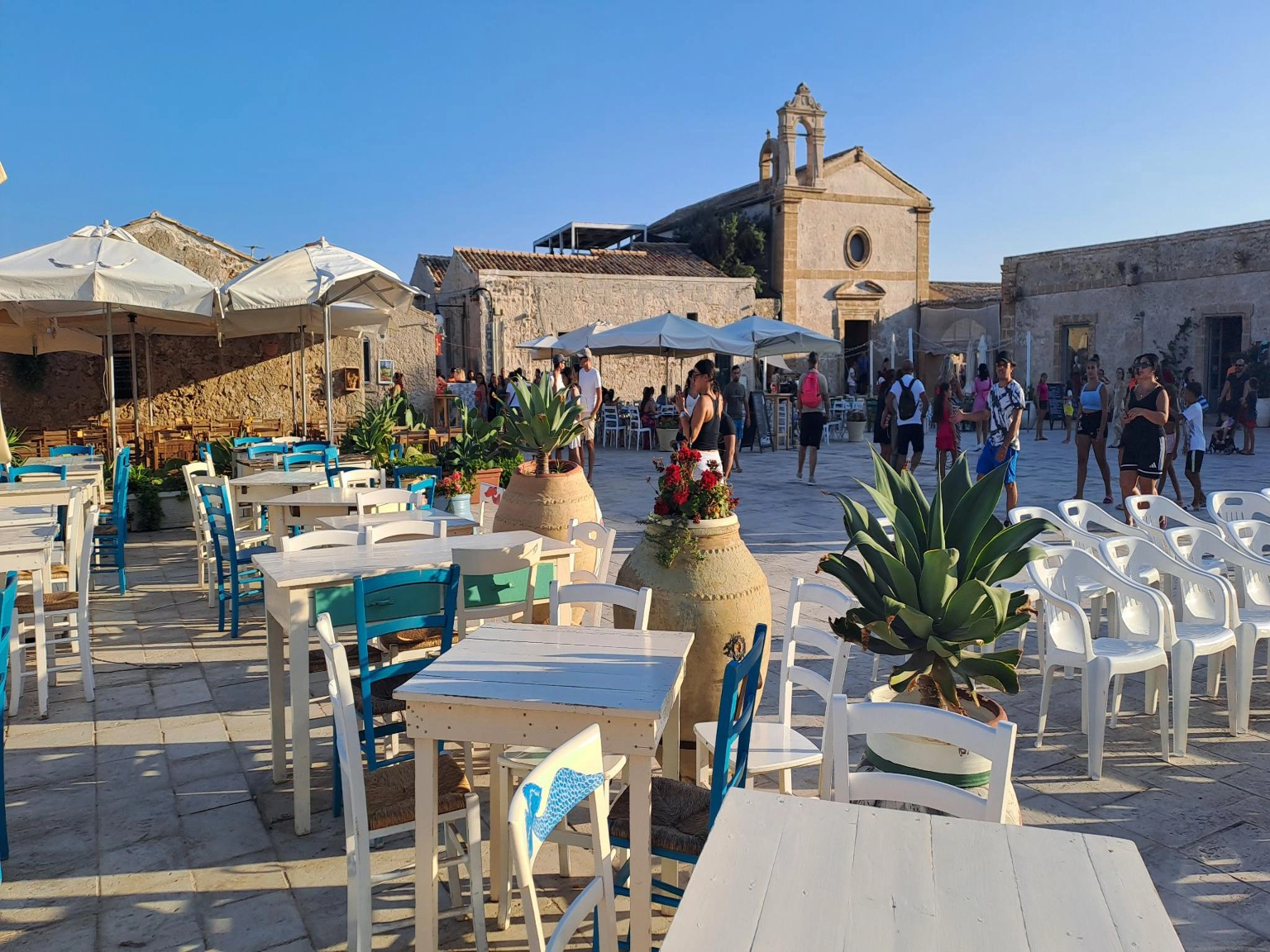 Comme Patricia et Philippe n'ont pas encore visité le village de pêcheurs, on est resté au mouillage ici. Le mouillage n'est pas vraiment dans un endroit idéal. On est en face d'une petite île privée sur laquelle est construite une jolie maison, et a peu près dans l'axe de sortie du port. Des 9h les italiens sortent le bateau pour la journée a vive allure, et avec la musique à fond sûrement pour couvrir le bruit du moteur. Ils sont quasi une dizaine par embarcation moteur a fond a nous passer a 4 m. Du coup on décide d'aller faire du repérage au nord de Marzamemi voir si on trouverait un fond sableux pour aller mouiller plus tranquille. Sur le chemin du retour en annexe, on s'arrête a la recherche de colonnes de pierre datant de l'époque romaine. Elles auraient couler avec un bateau qui les transportait. On a trouvé des coordonnés GPS sur internet, mais impossible de trouver ces colonnes. Une fois que nous avons déplacé le voilier au nouveau mouillage (plus tranquille du coup) je vois arriver le bateaux d'excursion avec vision sous marine s'attarder un peu plus au large et faire des cercles sur l'eau. Mmmmh il y a sûrement nos colonnes romaines par la bas. On ira explorer tout çà demain matin. Enfin on va faire un tour au village des pêcheurs. Bien plus animé que la veille pour moi, il est 18h30 et les touristes sont sortis des plages. La grande halle qui servait les pêcheurs des années 1700 a ranger les grandes barques en bois sert aujourd'hui de marché d'objets artisanaux. Attenant au bâtiment, une cheminée est protégée par des échafaudages. C'est l'emplacement de l'ancienne usine pour préparer le thon. Des vieilles barques sont toujours présentes mais très abîmées. Devant la halle, le pavage descent en pente douce pour mettre les barques a l'eau. Au centre du villages des chaises sont disposées face a l'église pour donner la messe a l'extérieure. L'église étant trop petite en saison touristique pour accueillir tous les participants. On prend un apéritif sur la place avec la messe qui se déroule a côté. Étrange de voir cette messe se passer au milieu de tous les restaurants ! Le prêtre fait son office comme si de rien était ! Les chaises devant lui toutes occupées. En rentrant au bateau, on s'inquiétait de la nuit a venir car tous les bars sur la côte sont avec la musique de boîte de nuit a font. Et le son porte très bien sur la mer. A 22h le calme est revenu. Visiblement la fête est limitée le dimanche. Ouf !