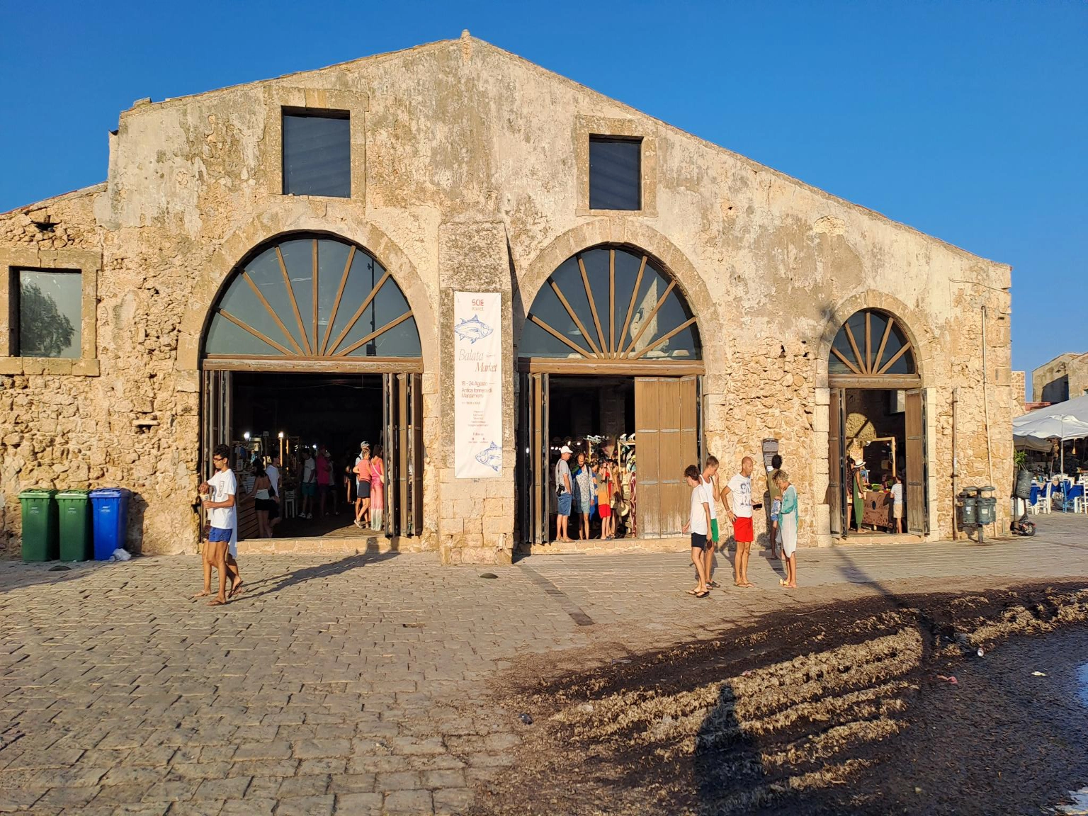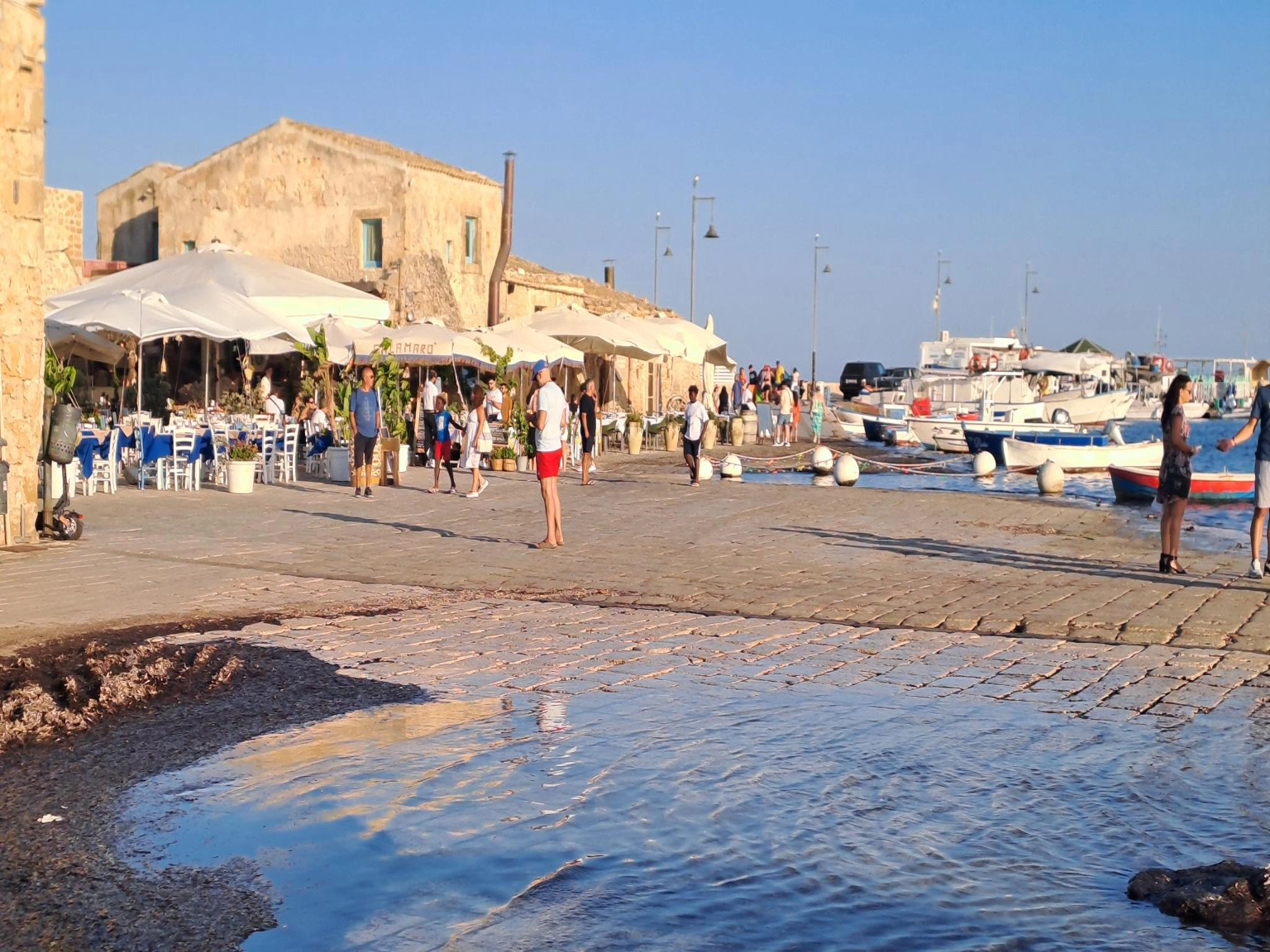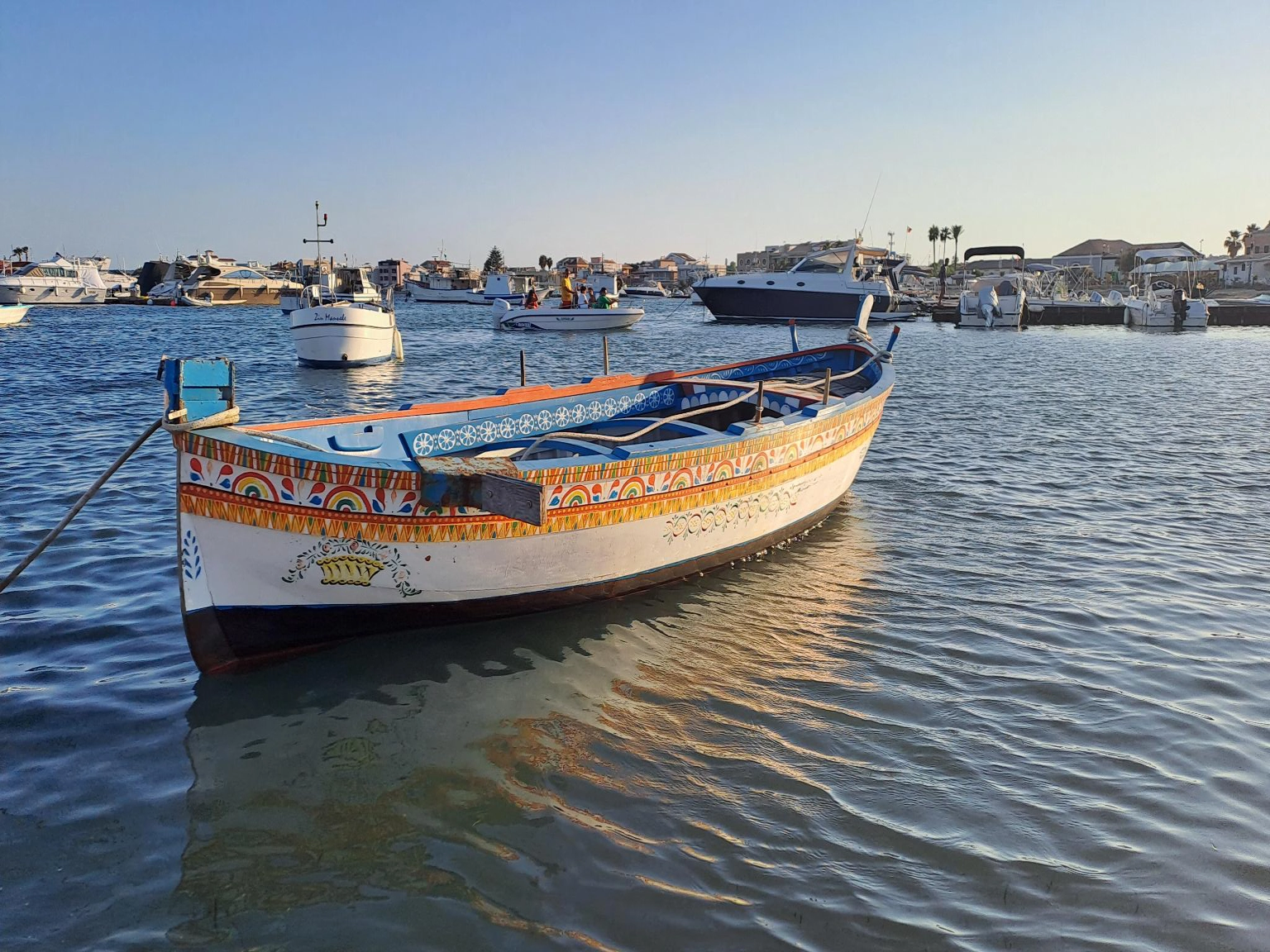 Comme Patricia et Philippe n'ont pas encore visité le village de pêcheurs, on est resté au mouillage ici. Le mouillage n'est pas vraiment dans un endroit idéal. On est en face d'une petite île privée sur laquelle est construite une jolie maison, et a peu près dans l'axe de sortie du port. Des 9h les italiens sortent le bateau pour la journée a vive allure, et avec la musique à fond sûrement pour couvrir le bruit du moteur. Ils sont quasi une dizaine par embarcation moteur a fond a nous passer a 4 m. Du coup on décide d'aller faire du repérage au nord de Marzamemi voir si on trouverait un fond sableux pour aller mouiller plus tranquille. Sur le chemin du retour en annexe, on s'arrête a la recherche de colonnes de pierre datant de l'époque romaine. Elles auraient couler avec un bateau qui les transportait. On a trouvé des coordonnés GPS sur internet, mais impossible de trouver ces colonnes. Une fois que nous avons déplacé le voilier au nouveau mouillage (plus tranquille du coup) je vois arriver le bateaux d'excursion avec vision sous marine s'attarder un peu plus au large et faire des cercles sur l'eau. Mmmmh il y a sûrement nos colonnes romaines par la bas. On ira explorer tout çà demain matin. Enfin on va faire un tour au village des pêcheurs. Bien plus animé que la veille pour moi, il est 18h30 et les touristes sont sortis des plages. La grande halle qui servait les pêcheurs des années 1700 a ranger les grandes barques en bois sert aujourd'hui de marché d'objets artisanaux. Attenant au bâtiment, une cheminée est protégée par des échafaudages. C'est l'emplacement de l'ancienne usine pour préparer le thon. Des vieilles barques sont toujours présentes mais très abîmées. Devant la halle, le pavage descent en pente douce pour mettre les barques a l'eau. Au centre du villages des chaises sont disposées face a l'église pour donner la messe a l'extérieure. L'église étant trop petite en saison touristique pour accueillir tous les participants. On prend un apéritif sur la place avec la messe qui se déroule a côté. Étrange de voir cette messe se passer au milieu de tous les restaurants ! Le prêtre fait son office comme si de rien était ! Les chaises devant lui toutes occupées. En rentrant au bateau, on s'inquiétait de la nuit a venir car tous les bars sur la côte sont avec la musique de boîte de nuit a font. Et le son porte très bien sur la mer. A 22h le calme est revenu. Visiblement la fête est limitée le dimanche. Ouf !