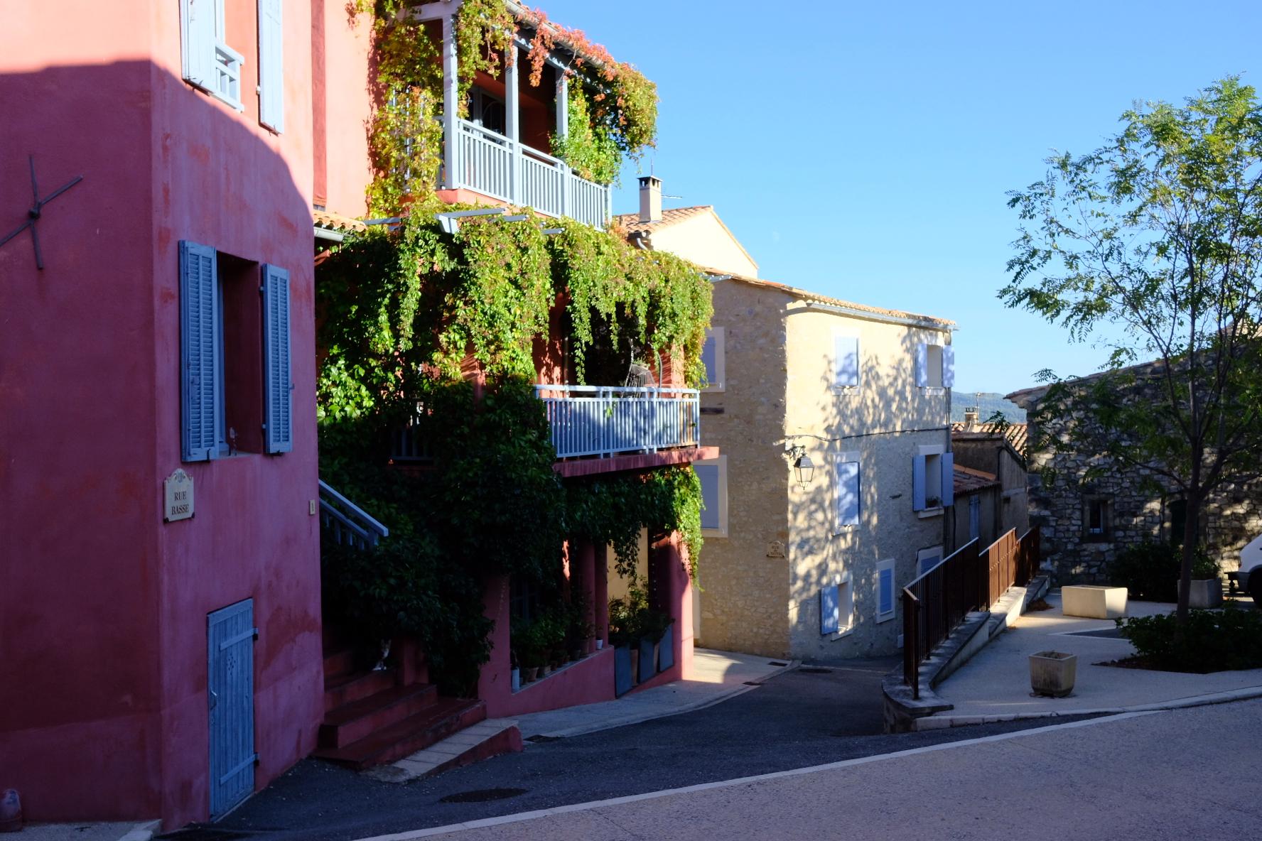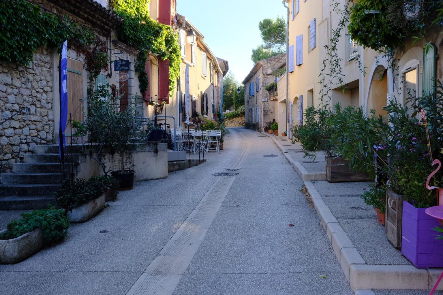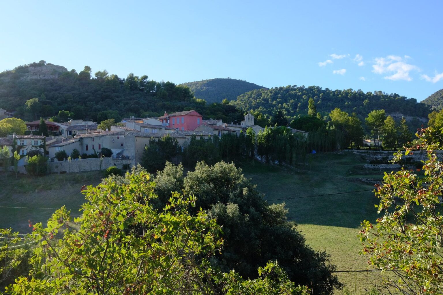 Ensuite on a roulé jusqu’à Pierrevert ou on a pris le pique nique avec le vent. Et puis beaucoup roulé… avec le vent ! Jusqu’à Vitrolles En Lubéron ou on est arrivé avec le VENT ! Le petit village niché contre le massif possède le minimum : une petite église avec une cloche qui sonne les heures, une fontaine, une petite place, et un git ou nous sommrs hébergés. Les maisons sont en bon état. Le château accolé au village est moderne et possède un grand parc en contrebas des ruelles.