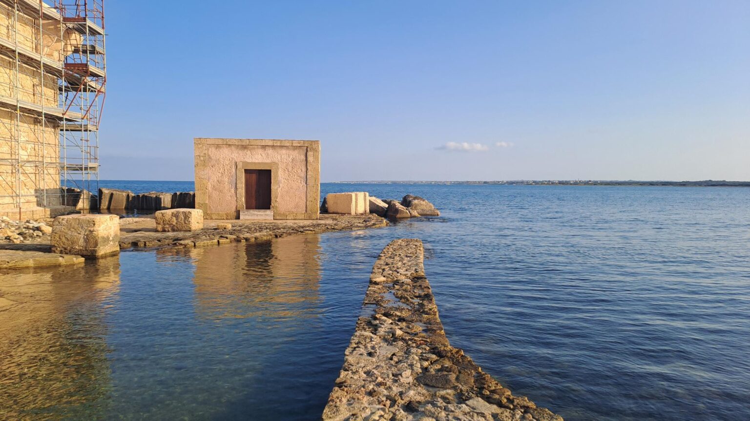 Ce sont de grosses pièces de pierre de 6m de long. L’eau claire permet de bien les observer. Le bateau d’excursion sous marine arrive pour sa première ronde et nous demande de partir car on fait obstruction a son activité professionnelle. Pas très poli l’italien !