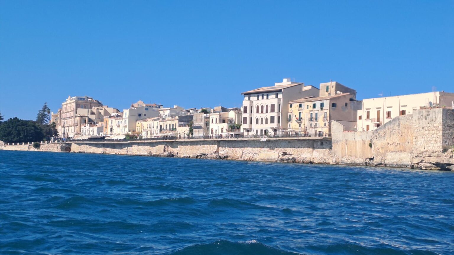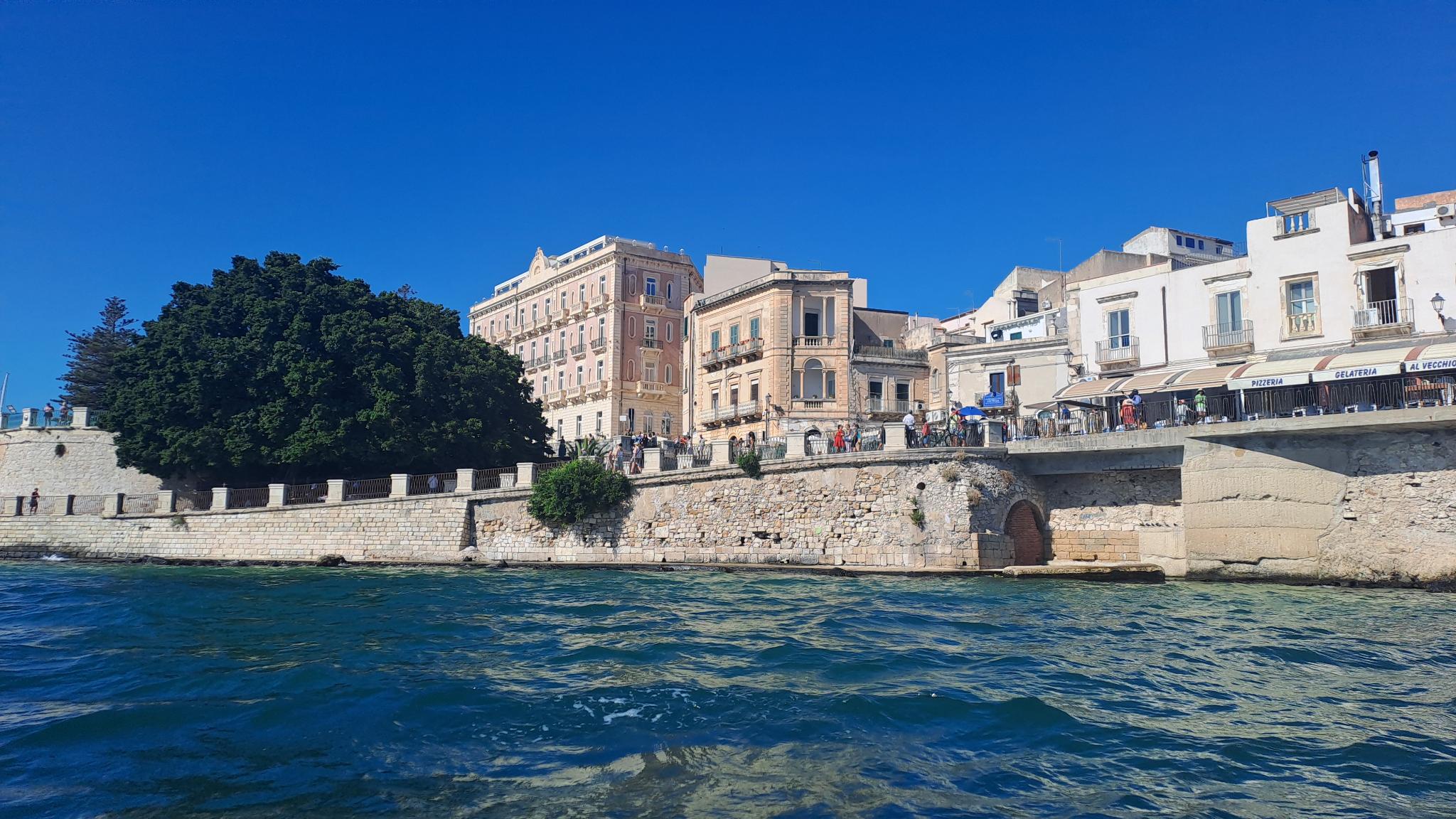 De retour sur notre petit semi rigide, on finit la boucle en longeant les remparts du Fort d’Ortigia.