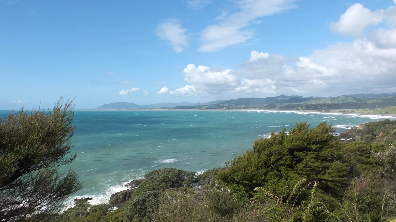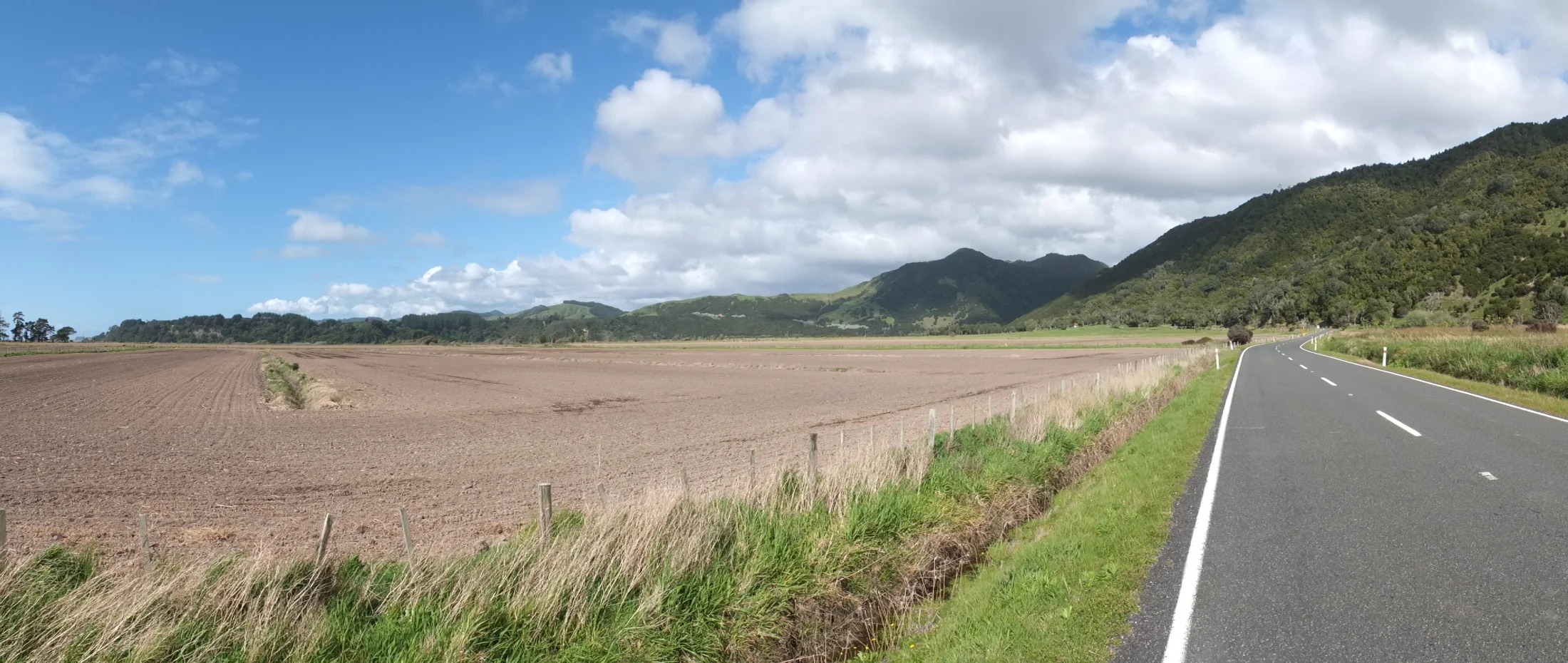 I’m going down through the biggest hill I’ve done so far. On the top, I had a break and met another traveller like me :-). He is going on the opposite direction. Poor him because he rides against the wind! This guy travels so lightly! I cannot figure out how that’s possible. Or maybe I’m the one carrying my apartment… He has four little bags of 10 liters each maybe and one mattress on top of his backpack. My 80l yellow bag could contain all his stuff. How does he manage to be so compact? I need to improve this part because I feel certainly too heavy. I could let go my pair of jeans, the new pullover I bought in Kerikeri, my swim suit and hat because I’ve never used them. That’s a total of 2,5 kilos roughly. Ah, and my heavy gum boots as well but I’m sure if I leave them now, in one week I will need them! So, that’s 4 kilos with the gumboots and… I still have many things to carry.